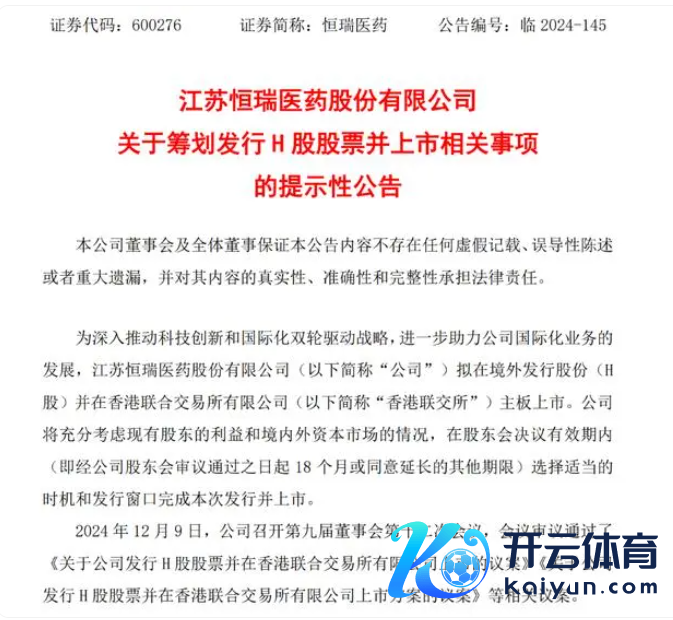 2024年12月9日,恒瑞医药召开了第九届董事会第十二次会议,会议审议通过了《对于公司刊行H股股票并在香港聚拢来回通盘限公司上市的议案》《对于公司刊行H股股票并在香港聚拢来回通盘限公司上市决策的议案》等联系议案。