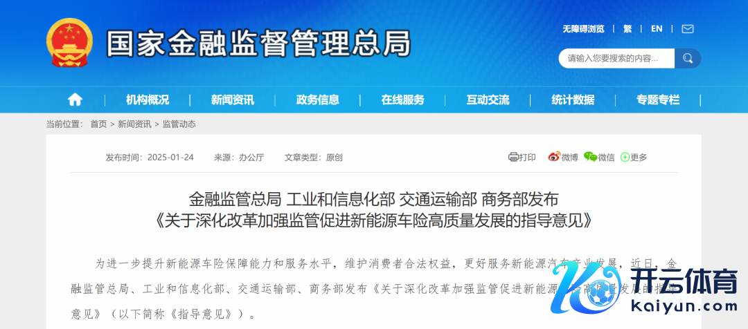 金融监管总局网站1月24日音尘,金融监管总局、工业和信息化部、交通运输部、商务部发布《对于深刻改良加强监管促进新能源车险高质地发展的率领办法》,围绕合理裁减新能源汽车维修使用资本、指点开发高赔付风险分摊机制和平台等方面推出一揽子计策举措,有用高慢东谈主民人人车险保障需求,更好处事新能源汽车产业高质地发展。